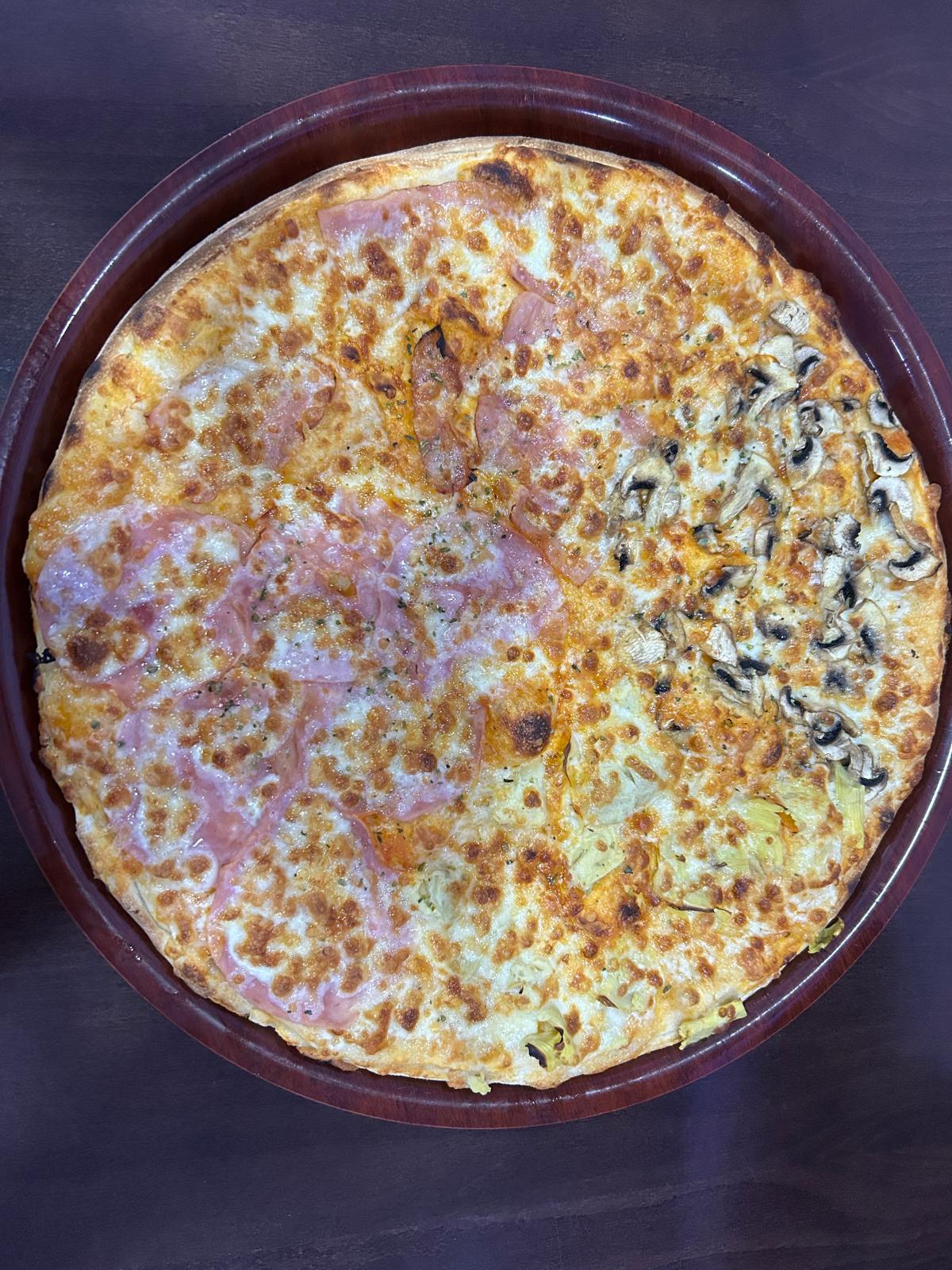 Salsa de tomate, queso, alcachofa, jamon york, champiñones