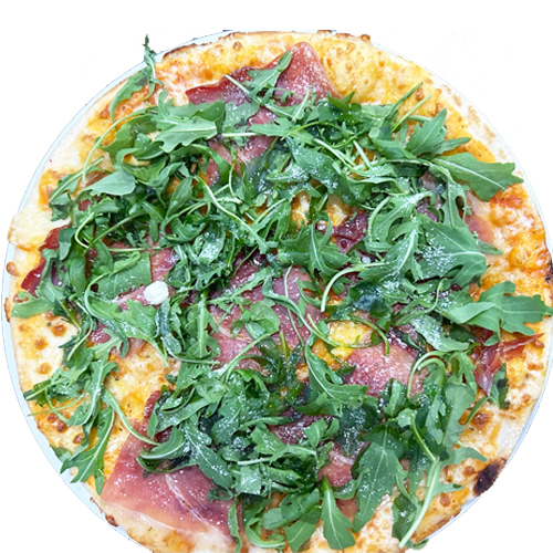 salsa de tomate, queso, jamón serrano, parmesano, rucula y aceite de oliva